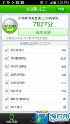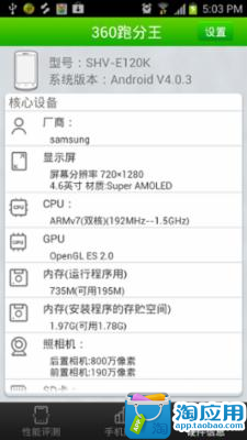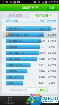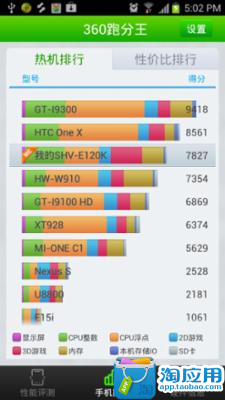 360跑分王是一款集硬件性能评测、性能排行、性价比排行、查看硬件信息等功能为一身的安卓手机硬件评测软件。整个评测过程浅显易懂,操作简单;本软件是首个推行性价比排行的评测软件,可以通过性价比排行让用户更多了解市场上的手机价格行情,对用户购买新机具有重要的指导意义;本软件的性能评测采用分段独立式评测方法, 使每项硬件评测的过程保持独立,使该项评测的得分更为精准。主要功能:1.一键跑分,硬件性能得分一目了然;2.整个评测过程只需3分钟, 快速、稳定;3.时实更新热门机型排行, 全面了解新机、热机的性能;4.性价比排行,给用户在购买新机时提供非常重要的依据;5.硬件信息,全面了解手机的硬件参数及系统信息。