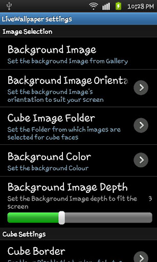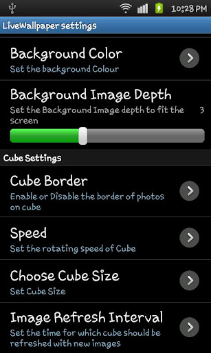 Cube size, speed, folder, and background colour of wallpaper can be customized through settings.