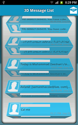 We are turning from 2D phase to 3D phase, best time to entertain third dimension. Let’s come to calibrate one of the unique ideas which is 3D Message list. I entertained it and I just in love with 3D Message List. You know what I changed my style and 3D Message List made me more stylish. 3D Message List makes me ease to use message and feel me reliable to use messages. When you use 3D Message List an ultimate app, you feel 3rd edge which seems a 3D cubic box with name and message display. Just get rid off from the boring message inbox and conversation, take the advantage of 3rd edge which is not possible yet we made it. 3D Message List, first application at play store with unique idea and functionality. Entertain a magical and unlimited spell of 3D Message List and adopt this 3D latest fashion.