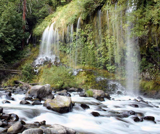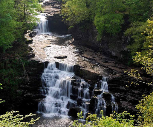 A waterfall is a place where flowing water rapidly drops in elevation as it flows over a steep region or a cliff.