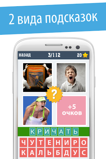 Вас ожидает более 100 разнообразных уровней, 2 подсказки: убрать все лишние буквы и открытие первой буквы в слове. В отличие от игры 4 фотки 1 слово в данной игре изначально открыта всего одна картинка, но можно открыть и остальные, но за отгадывание слова будет начислено меньше очков.