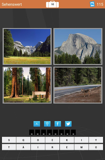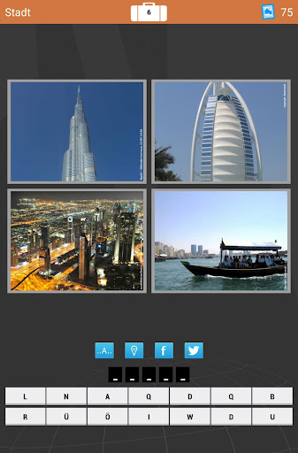Dir werden 4 Bilder gezeigt und du musst den passenden Ort dazu finden! Schwelge in Urlaubserinnerungen oder begib dich auf die Reise in fremde Gefilde mit Fotos von Sehenswürdigkeiten, bekannten Gebäuden und Locations. Die Orte sind bestimmten Kategorien zugeordnet wie z.B. Stadt, Land, Bundesland, Insel, Kontinent, Freizeit, Arbeit und Sehenswert. In Updates kommen noch mehr dazu.
