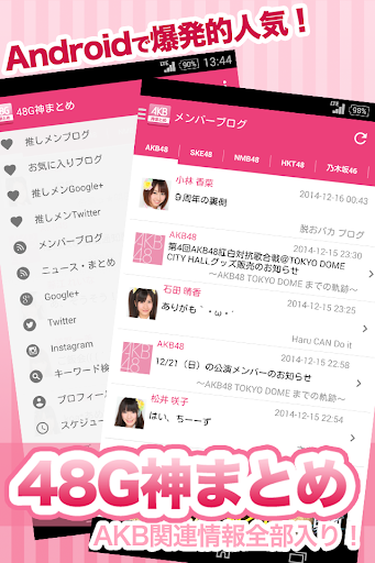 メンバープロフィール、メンバーブログ、ファンによる2chまとめブログ、ぐぐたす、Twitter、Instagramなどの情報を一括で把握することができます。
