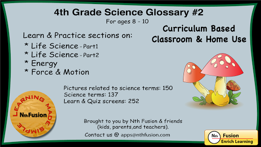 This app is a continuation of the 4th grade science glossary series. Fourth graders need to learn science related vocabulary. Understanding these glossary terms are paramount to kids as they help build foundational knowledge and understanding, not only in current grades but also in higher grades. One of the good ways to learn science words is to go through the word, it's definition, and have some contextual meaning. This is precisely what is available through this 4th grade glossary # 2 App.
