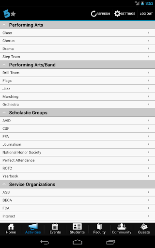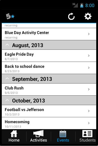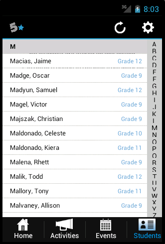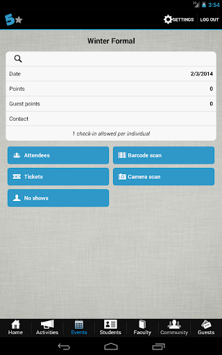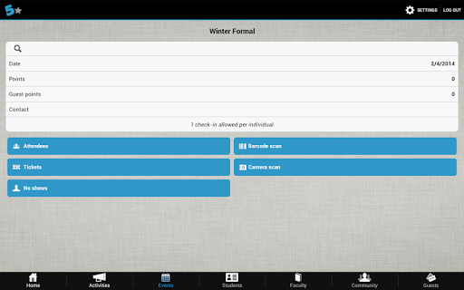 Access 5-Star Students data on your Android device! View all your activities, events, students, faculty and community members. Plus, get activity participation and detailed event attendance data. Check-in individuals at events using a Bluetooth barcode scanner or your device camera.