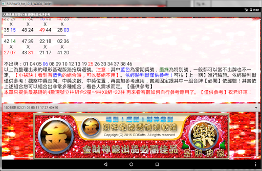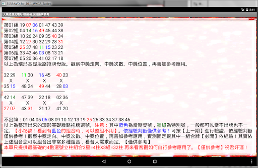 大樂透歷史環形4數基礎版路拖牌參考說明:環形基礎版路拖牌母版。觀察中獎走向、中獎次數、中獎位置,再善加參考應用。注意:其中藍色為當期獎號,墨綠為特別號,一般都可以當不出牌也不一定。【小祕訣!看到有藍色的組合時,可以整組不用】依經驗判斷僅供參考!可按【上一期】進行驗證。依經驗判斷僅供參考!"+"觀察中獎走向、中獎次數、中獎位置,再善加參考應用,實測固定跟其中一組合牌【必開】依經驗!其實依上述組合您可以組合出非常多種組合,看各人需求而定。【僅供參考】本單只提供最基礎的4數選號立柱組合2星=4柱X8組=32柱 再來看客觀如何自行參考應用了。【僅供參考】祝君好運!可大大提高中獎機率的好用軟體【金財神爺出品必屬佳品】