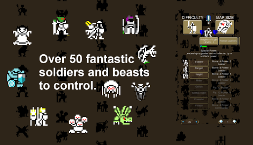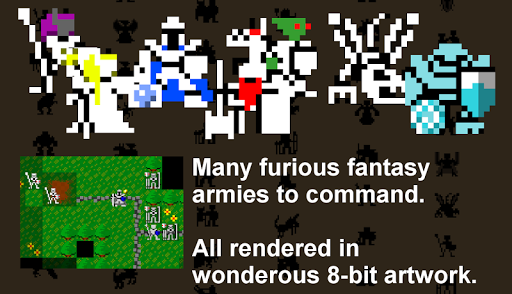Adventure into the fantasy world! The time of beasts is over and the reign of warlords unfolds over the lands in this super addictive retro look game. Train your 8bit armies in this turn based strategic war game where fantasy armies battle over forgotten lands for dominance. Fight to capture the stronghold, and each victory will give additional power, bringing a wider array of soldiers and monsters into the battles ahead.