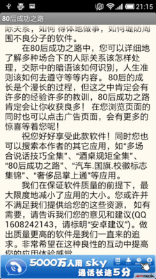 教你怎样少走弯路,告诉你高手的经验,告诉你名人的定律,告诉你如何面对当今社会的现实,告诉你需要堤防的对象。80后走向成熟成就自己霸业的必读经典!更新日志:新版本更新广告显示模式,修改了配置文件.