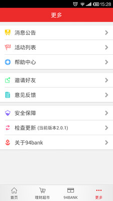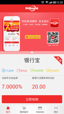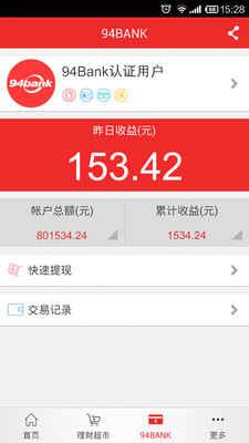 94bank( www.94bank.com)是统领得一网络科技(上海)有限公司推出的一款金融理财类手机软件,为用户精选了远超银行活期收益、极低风险、买卖便捷的金融银行理财产品,同时具备资产管理、收益查询、购买等便捷功能,从此无需在银行营业网点排队,甚至不用在电脑前操作,就能像浏览新闻一样,利用午休、通勤等碎片化时间,随时随地,方便快捷地实现自身的财富增值!