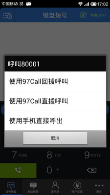 97CALL免费电话直拨全国电话低至3分钱,国际更便宜,还可发短信