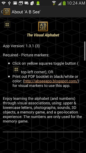 Enjoy learning the alphabet (and numbers) through visual associations, using: upper & lowercase letters, photographs, sounds, 3D objects, a memory game, and a geo-location experience. The numbers are only used for the ABSee memory game.