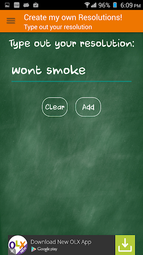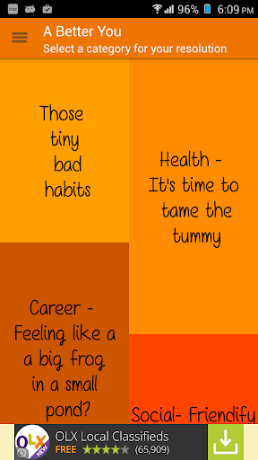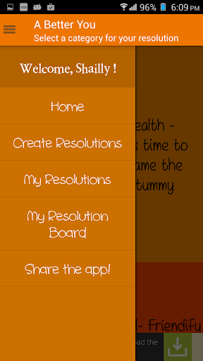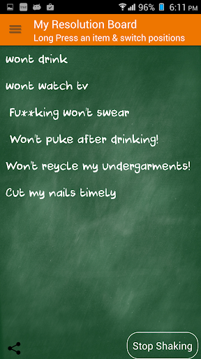 Its a colorful application which lets you choose your new year resolutions from different categories like your job life,health,family,introspection etc and lets you pin them to your resolution board. The resolution board is just like your green chalkboard where you can maintain all your resolutions. You can share your resolution board on FB ,Whatsapp and all the other social sites to let the world know you have decided to change yourself and you will make it happen.