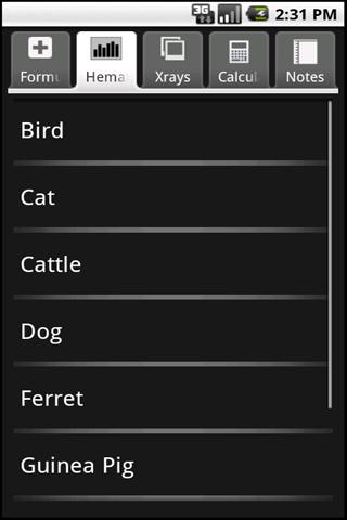 - The second application contains common blood value lab results for birds, cats, cattle, dogs, ferrets, guinea pigs, horses, and turtles.