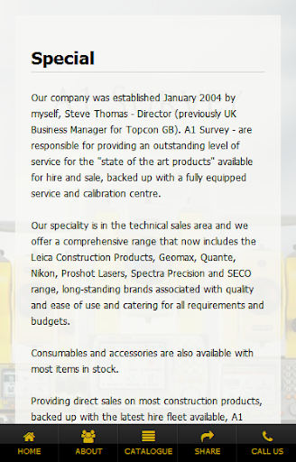 Our company was established January 2004 by myself, Steve Thomas - Director (previously UK Business Manager for Topcon GB). A1 Survey - are responsible for providing an outstanding level of service for the "state of the art products" available for hire and sale, backed up with a fully equipped service and calibration centre.