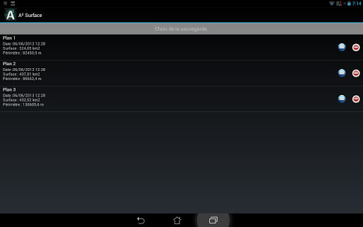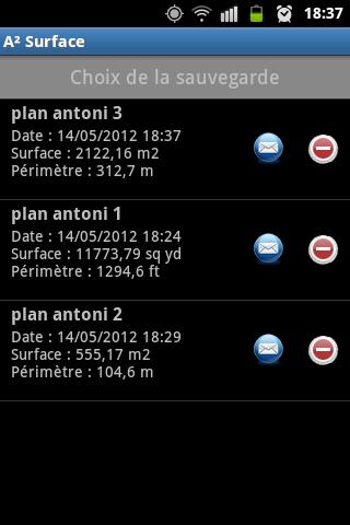 - La liste des sauvegardes affiche la date, la surface et le périmètre des terrains sauvegardés.