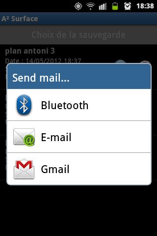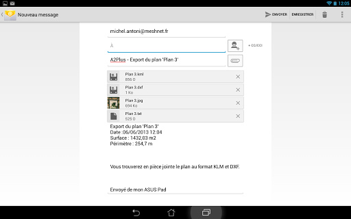 Pour exporter un plan avec le format 'KML' et 'DXF', vous devez vous rendre dans la liste des sauvegardes puis appuyer sur l'icone 'e-mail'. A2 ajoute, dans le e-mail, le plan en pièce jointe. Il vous suffit d'écrire le destinataire et d'envoyer le message.