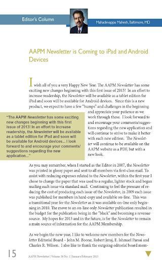 The Newsletter of the American Association of Physicists in Medicine contains timely information and serves as a forum for lively debate about issues of interest to AAPM members. It is published bi-monthly. The Newsletter is comprised of regular articles from AAPM officers, including and not limited to the President, Chairman of the Board, the Treasurer, as well as periodic articles from the chairpersons of various committees reporting about their activity. The Newsletter is also comprised of articles from AAPM staff, including and not limited to the Executive Director and the Government Relations Manager. (Letters to the Editor, news items regarding chapter activity, awards, grants, testing results, and new member listings are regularly included and many of these items are provided by AAPM members.) The AAPM encourages its members to submit items of interest, including photographs whenever possible, to the editor for consideration. In addition, a limited number of AAPM non-profit and corporate affiliate only advertisements are included in each edition of the AAPM Newsletter.