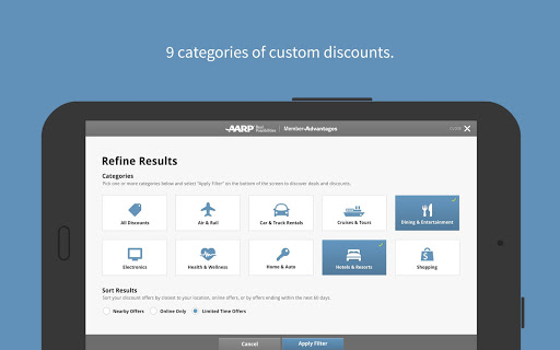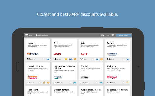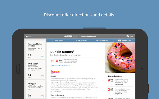 AARP offers, discounts and coupons from your favorite and closest local shops, restaurants, and services are available whenever you may go! No need to always carry your card around as your phone can serve as both your AARP ID and your coupons! AARP Member Advantages delivers relevant and closest discounts including: