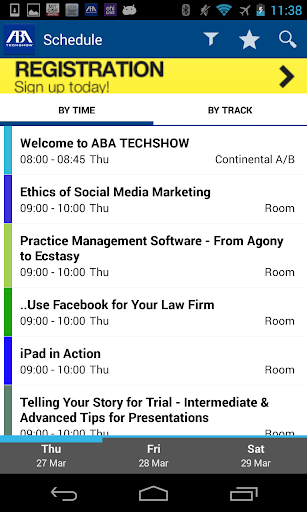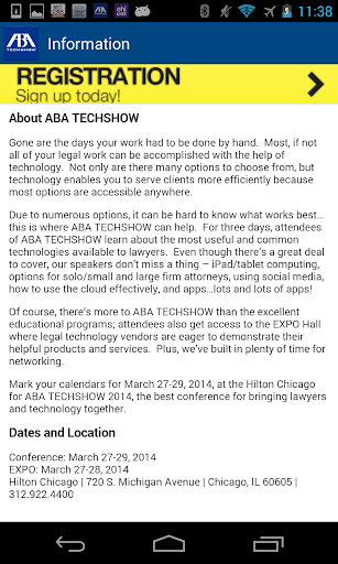 The ABA TECHSHOW App is your mobile guide to the entire ABA TECHSHOW Conference and EXPO. View the schedule and bookmark your favorite sessions, exhibitors, and speakers so you can plan your time accordingly. See what sessions are underway or are next up. Provide your session evaluations electronically.. Schedule your Taste of TECHSHOW dinners. Use the Conference hashtag, #ABATECHSHOW and see what everyone is talking about on the Twitter feed. Synchronize your conference information across all of your devices. Plus the ABA TECHSHOW App gives attendees exclusive access to the Conference materials on their mobile device.