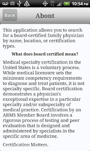The ABFM Physician Directory provides real-time information from the ABFM database regarding the board certification status of family physicians. As new ABFM board certification no longer show end dates, this app allow the user to determine if the family physician is currently board-certified. This app uses the city and state provided by each ABFM board-certified physician and is not necessarily the physician's city and state of practice.
