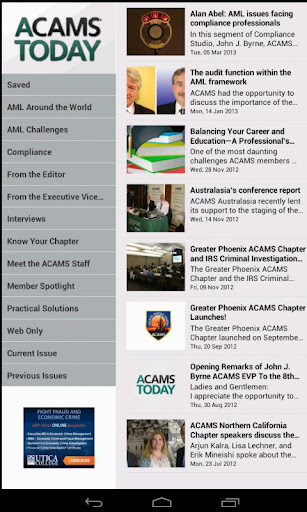 The app is free of charge for all ACAMS members and includes articles from the ACAMS Today printed magazine, plus additional digital-only content. Visit www.ACAMSToday.org for more information.