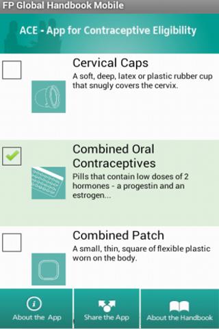 The ACE mobile app gives family planning providers an easy and effective way to check whether clients are medically eligible to start using certain contraceptive methods. Based on the popular and trusted Family Planning: A Global Handbook for Providers (2011 edition), ACE reflects the latest family planning guidance from the World Health Organization’s Medical Eligibility Criteria for Contraceptive Use. The Global Handbook is published by the World Health Organization and the Johns Hopkins Bloomberg School of Public Health ∙ Center for Communication Programs with support from the U.S. Agency for International Development.