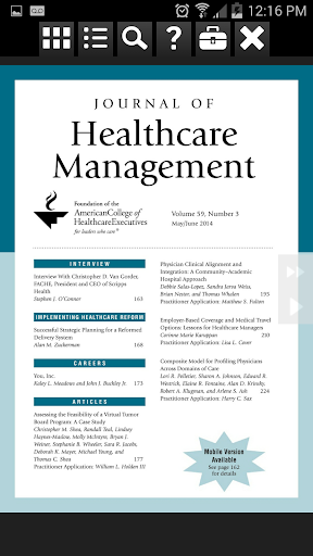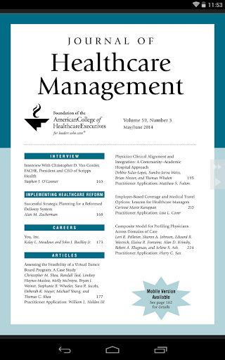 The American College of Healthcare Executives Publications App is designed to provide an enhanced online experience for readers of Healthcare Executive magazine, the Journal of Healthcare Management and Frontiers of Health Services Management. The app is intended for use by ACHE members and publication subscribers only; log-in will be required after download.
