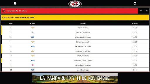 La aplicación realiza seguimiento de las 4 categorías regenteadas y fiscalizadas por la Asociación Corredores Turismo Carretera (ACTC).