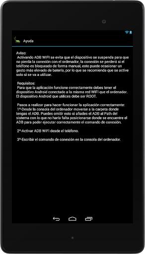 Para que la aplicación funcione correctamente debes tener el dispositivo Android conectado a la misma red WIFI que el ordenador. El dispositivo Android que utilices debe ser ROOT.