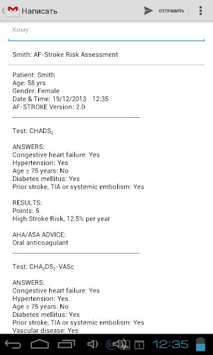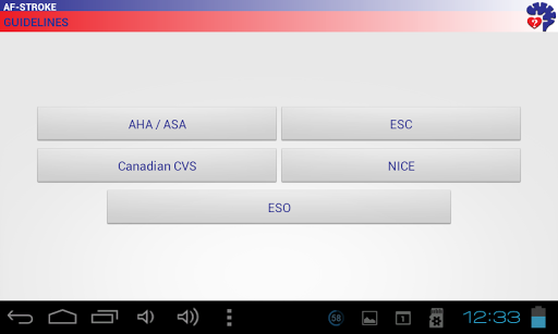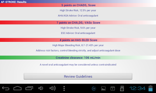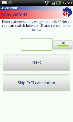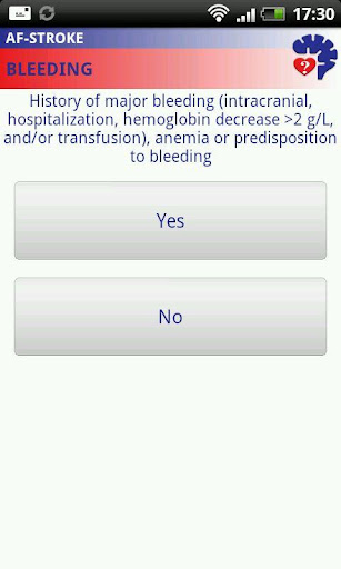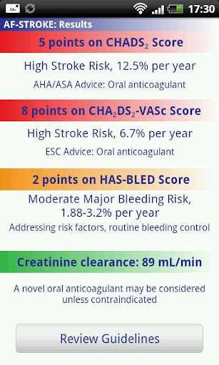 AF-STROKE is a simple application to assess patients with atrial fibrillation (AF) against stroke risk factors and to help choose appropriate antithrombotic therapy for stroke prevention. It calculates at once CHADS2, CHA2DS2-VASc, and HAS-BLED scores and creatinine clearance according to the Cockcroft-Gault equation. Based on the score results, the latest ESC and AHA/ASA advice on antithrombotic therapy is given. It is known to be crucial to check creatinine clearance before prescribing novel oral anticoagulants to avoid serious complications. The application warns you about the contraindication or necessity for a dose reduction, if creatinine clearance is abnormal. Finally, the latest ESC, ESO, AHA/ASA, NICE, and Canadian Cardiovascular Society guidelines are available for reviewing.