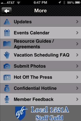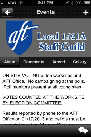 Welcome to the AFT College Staff Guild, Local 1521A Mobile App. The AFT Staff Guild is the exclusive representative of the Clerical/Technical Unit of the Los Angeles Community College District. Our continued effectiveness as representative depends to a large degree upon the participation of our members. You are most cordially invited to interact through the App, attend our meeting and become involved in the work of our committees. There are Worksite Meetings, Executive Board Meetings, General Membership Meetings, as well as Conferences. All Staff Guild members are entitled to participate in a series of CFT/AFT insurance programs. The Staff Guild exists to serve its members by representing their viewpoints and ideas to the administration and before the Board of Trustees, and the Personnel Commission, by initiating and effectuating educational and personnel reforms, by protecting the member's professional standards, status, and rights and by representing Unit I classified employees at the collective bargaining and consultation table. If there is any way in which we can be of assistance, do not hesitate to use the App to call the officers of the Staff Guild, your colleagues in the District.