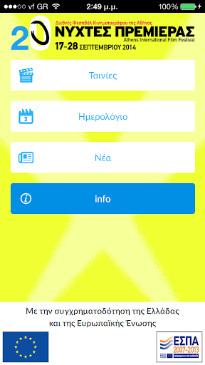 Η εφαρμογή που σας ξεναγεί στο μαγικό κόσμο του Διεθνούς Φεστιβάλ Κινηματογράφου της Αθήνας - Νύχτες Πρεμιέρας. Ενημερωθείτε για το Φεστιβάλ, μάθετε τα πάντα για τις ταινίες, διαβάστε περιλήψεις και συντελεστές, δείτε το πρόγραμμα και τη διαθεσιμότητα εισιτηρίων από το smartphone ή το tablet σας.
