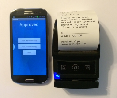 To make payments processing as simple as possible, AIRCHARGE also offers the AirBLUE Mini hardware, which allows credit cards to be swiped, thus reducing your processing fees. And the printing option allows you to hand a receipt to the customer at the point of sale.