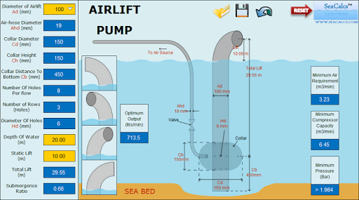 Airlift Pump 3D is the new application of a series of Animated Marine Calculations for the professional and recreational mariner/diver.