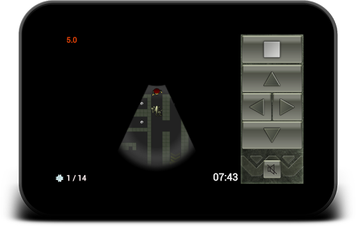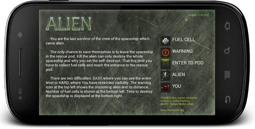 There are two difficulties. EASY, where you can see the entire level or HARD, where You have restricted visibility. The warning icon at the top left shows the oncoming alien and its distance. Number of fuel cells is shown at the bottom left. Time to destroy the spaceship is displayed at the bottom right.