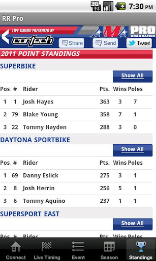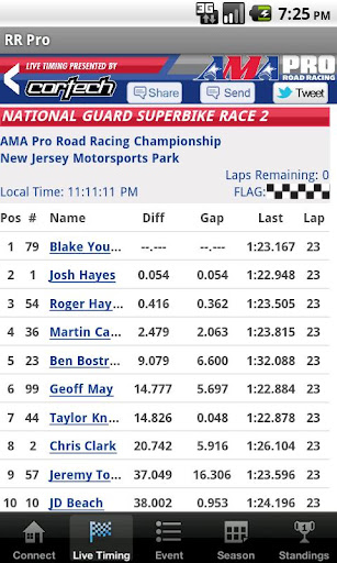 Live Timing of all on-track activity is included, as well as event and season schedules, session results, rider point standings. Rider headshots, bio information and full session laptime data for all riders in any active SuperBike, Daytona SportBike, SuperSport or XR1200 session by clicking on a rider's name on the Live Timing page.