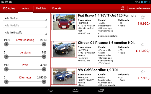 • Übersichtliche Darstellung der wichtigsten Stammdaten der Fahrzeuge in der Fahrzeugliste (Marke, Modell, Erstzulassung, Leistung, Treibstoff, Farbe, Kilometerstand, Preis)