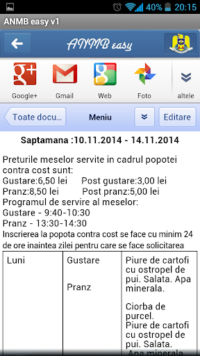 -contine un document online cu meniul saptamanal al Cantinei/Popotei studentesti.