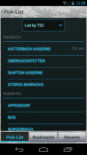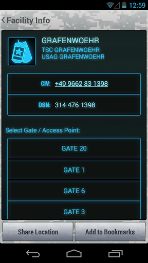 Determine your current location, choose from a list of available training facilities and plot a route to the gate of your choice. See nearby gas stations that accept USAREUR fuel cards, and even search for them by name.