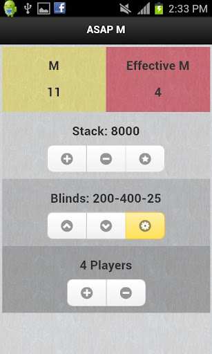 Stack, blinds and player number can be modified without time consuming text input giving you more time to consider your play instead of waiting for calculation.