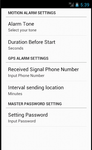 When you choose this menu, ATA will request to fill the alarm password. This alarm will be activated when a device is taken away so far less than 100 meters from its original position. The program will send a message to other device. The message contains its current location. The way to stop this effect is same as motion alarm effect.