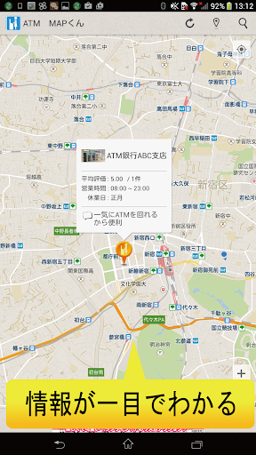 ・MAP上の『ATMピン』をタップするだけで、何銀行のATMなのか?何時まで利用出来るのか?など、知りたい情報を手軽に一瞬で確認する事が出来ます。