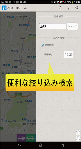 ・虫眼鏡のマークをタップすると、MAP上で絞込み検索機能のチェック項目欄が表示され、あなたの探しているATM情報を絞り込んで探す事が出来ます。