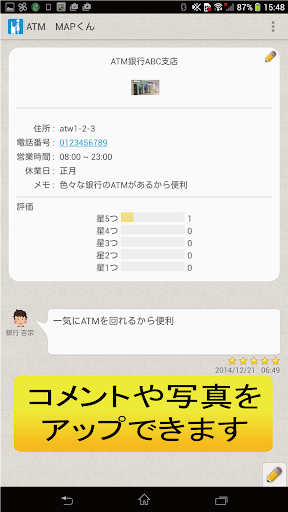 ・コメント、カメラ機能を搭載しているので、利用した時の状況をコメントしたり、ATMの場所の写真をUPしたりして、ATM