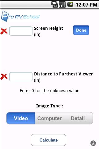 AVDistanceCalc is a calculator for screen size and maximum recommended viewing distance. The formula is based on three different methods, discussed in depth on a blog post at ProAVSchool.com and is usable for Professional and Commercial Audio Visual System Design calculations.
