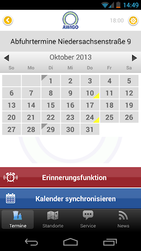 Nachdem Sie Ihren Standort ausgewählt haben, werden Ihnen Ihre Abfuhrtermine für Restmüll, Bioabfall, Altpapier und Verpackungsmüll (Gelber Sack) im Kalender angezeigt.