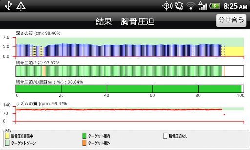 • 実際の圧迫速度および深さを測定し、もっと速く押してください、もっと強く押してください等と通知します。