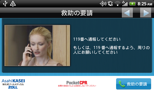 注意: PocketCPR for Android ™は現在、トレーニングおよび練習のみを目的としています。本アプリケーションは、実際の救命においての使用は米国の FDA にまだ認められていません。