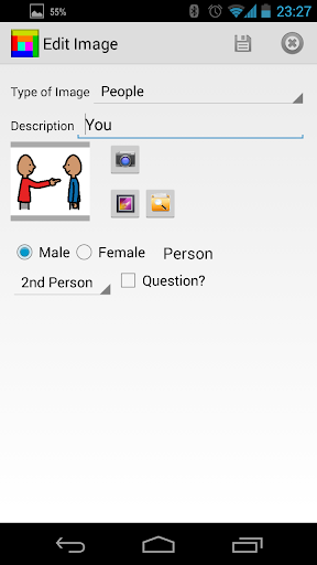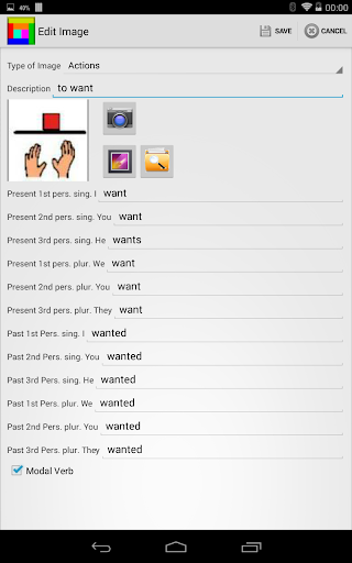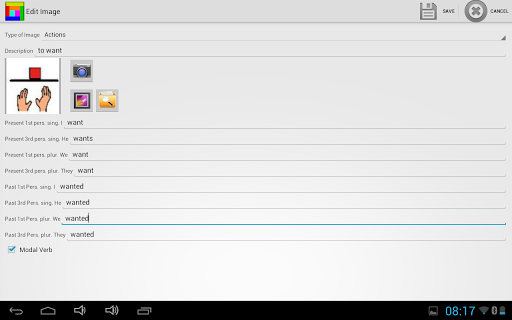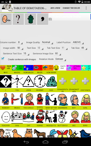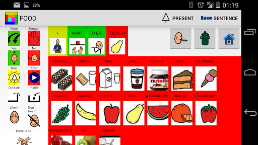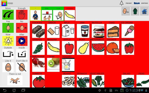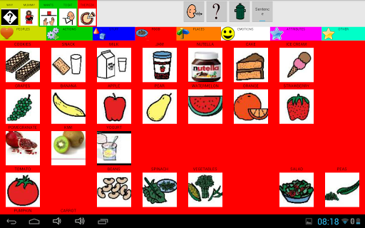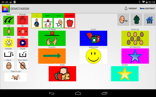 The tables are divided into 8 categories, People, Actions, Emotions, Objects, Food, Places, Adjectives, Other. You can decide to build a simple phrase or tap and talk.