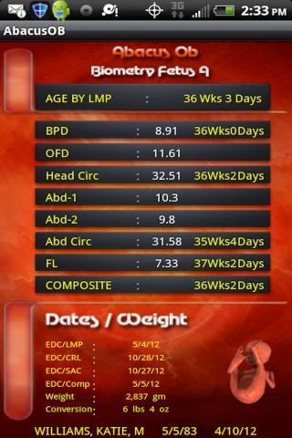 Introducing the All New “Abacus Ob Prime” Obstetrical Ultrasound Biometry Calculation Application. The Abacus OB Prime allows Physicians, Technologists, Midwives, Nurses and other healthcare professionals to rapidly, efficiently and accurately determine the age, weight, due dates and relative volume of Amniotic Fluid of any pregnancy from 4 weeks to 40 weeks - and beyond. This medical application performs on any device that utilizes the Android Operating System, from mobile phones to tablet computers.